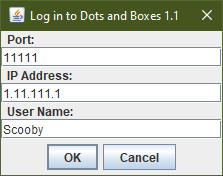 After the host has started the server, each player should start the Dots and Boxes game on their own computer and enter the port, IP address, and player name exactly as set up by the host in the Dots and Boxes Server.