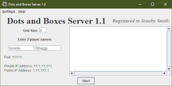 - Start the Dots and Boxes Server program.