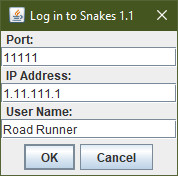 After the host has started the server, each player should start the Snakes game on their own computer and enter the port, IP address, and player name exactly as set up by the host in the Snakes Server.