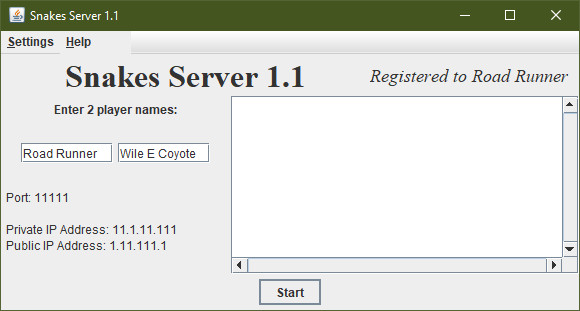 The Snakes Server program displays the port, public IP address, and private IP address it is using. The host may copy those numbers and paste them in an email or off-game message to the other players.